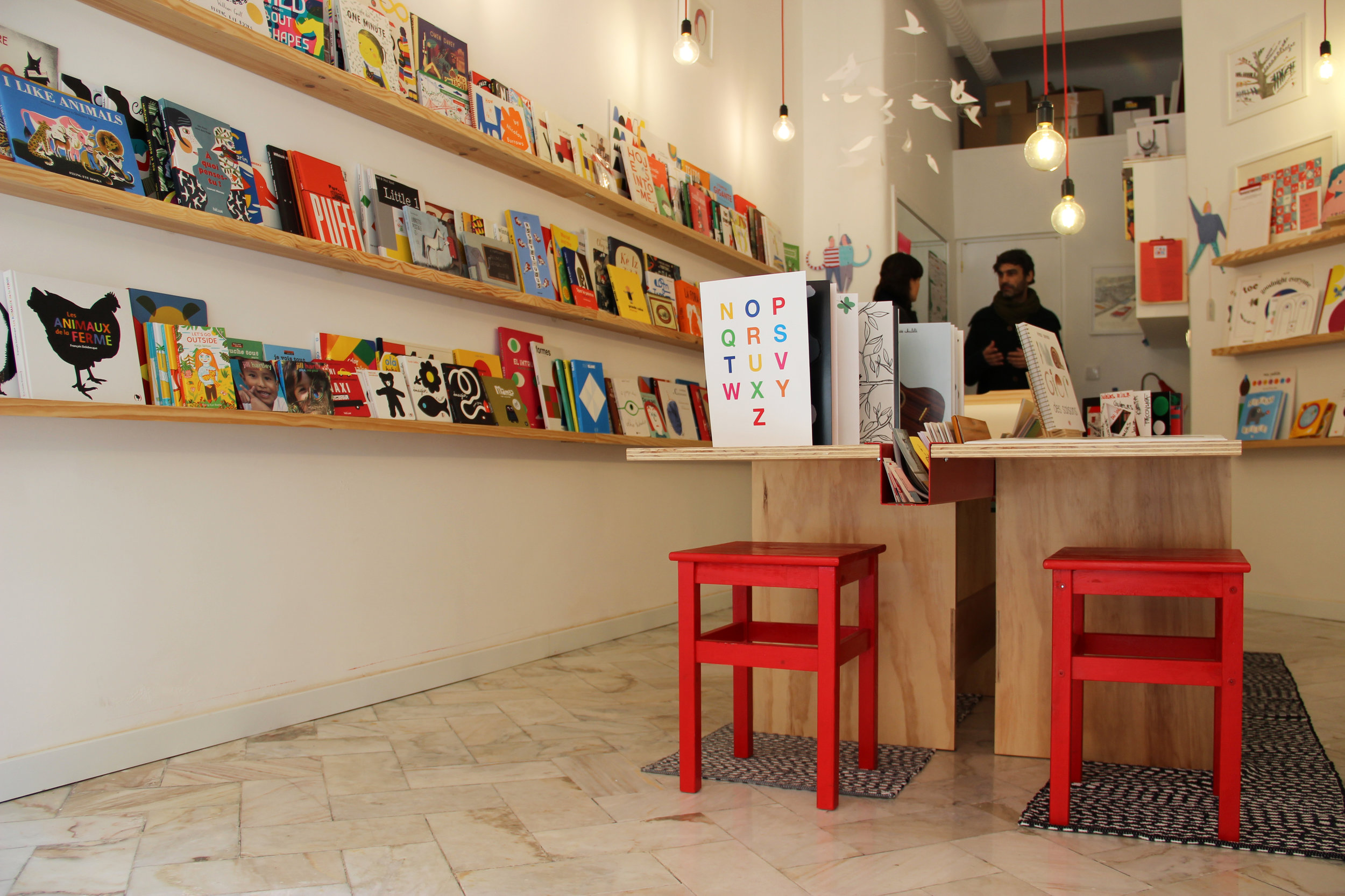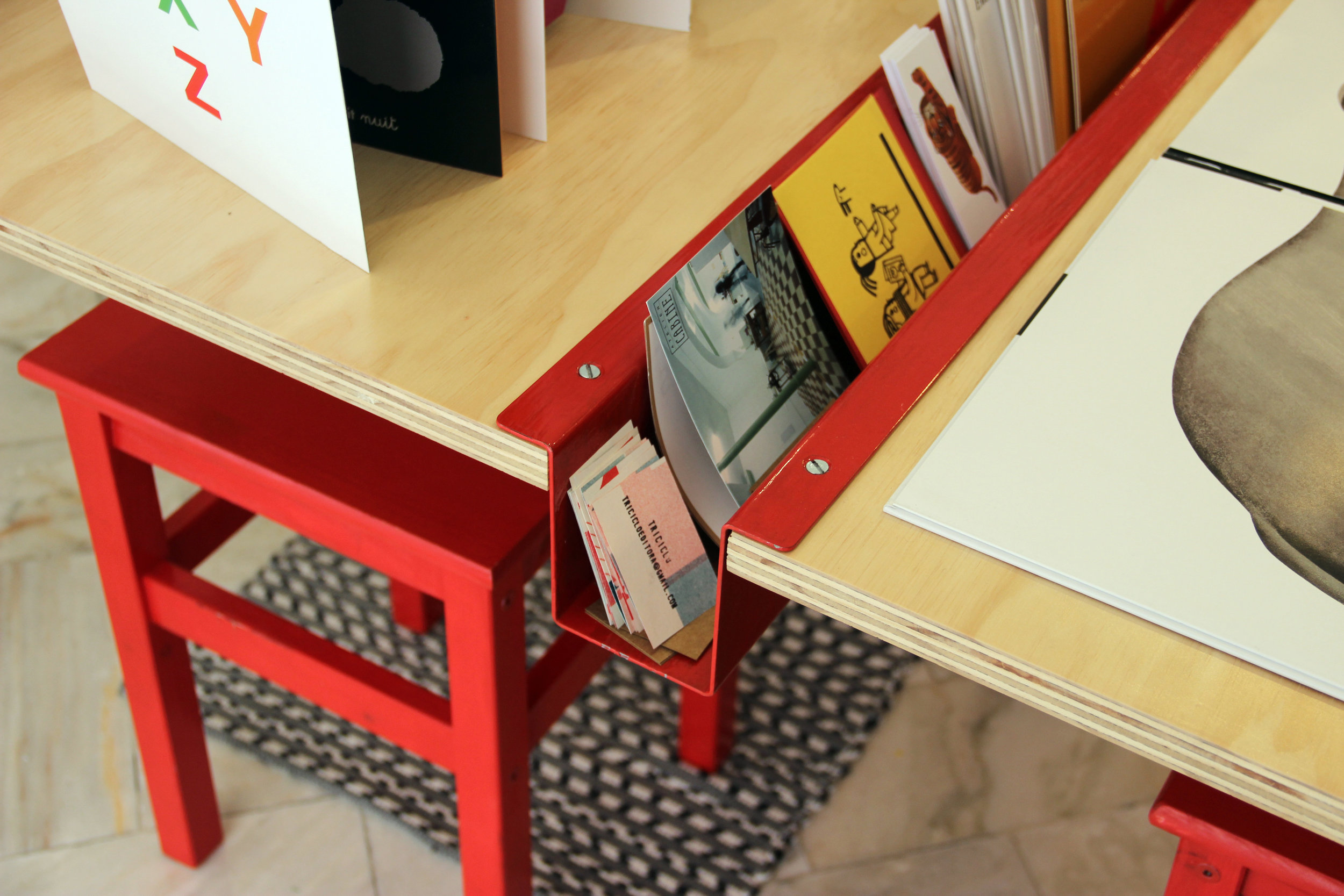 A necessidade de uma mesa com bancos para uma livraria infantil, que pudesse servir para exposição de livros e acolhimento de oficinas interativas de crianças e adultos, motivou a proposta. Pensamos num objeto de poucos elementos – o contraplacado de madeira e a chapa metálica - fáceis de construir e que garantissem identidade ao conjunto e à livraria. A mesa é estruturada por chapas de contraplacado em módulos de 60cm, e abas em balanço, conectadas pela chapa metálica dobrada que funciona como viga de travamento e como recorte para o abrigo de livros e materiais de desenho. As cadeiras são cubos de chapas que, invertidos, podem ser usados por crianças ou adultos.